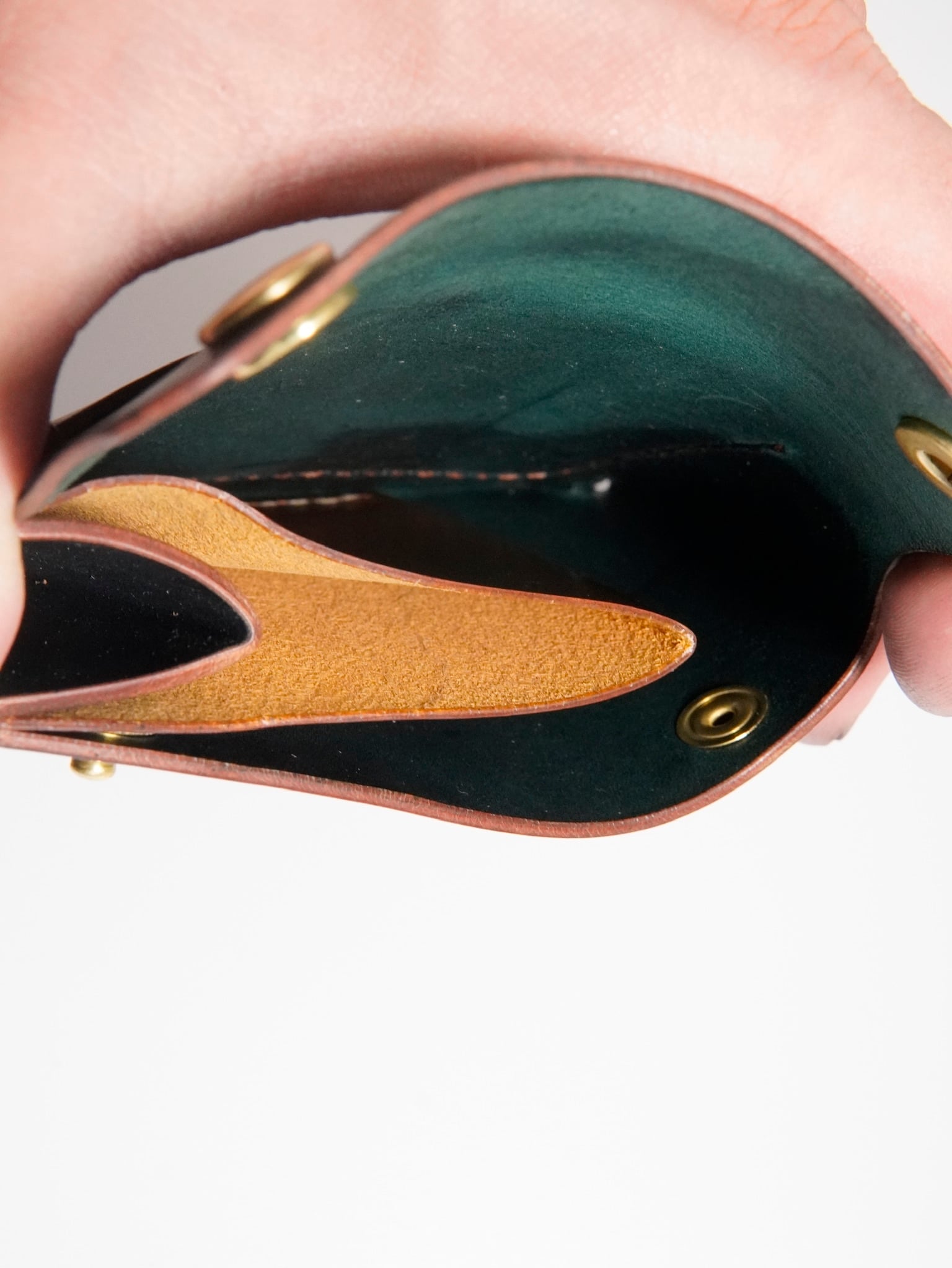 • 真鍮製のホック: 表面にロゴが入らない無垢なデザインにこだわり、パーツ選びから納得のいくものを探した結果、辿り着いた高品質な真鍮製ホックです。革とともに深みを増していく、真鍮特有のエイジングも楽しんでいただけます。